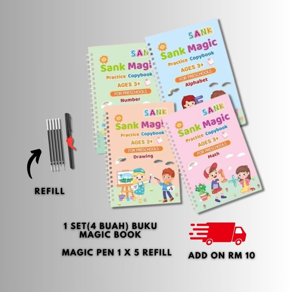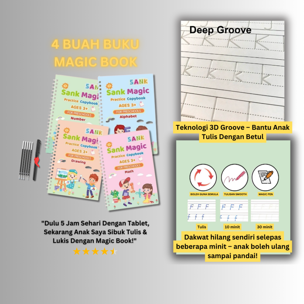 Buku yang direka khas untuk membantu anak anda kuasai asas 3M dengan lebih teratur dan sistematik. Dengan Magic Book, mereka akan dapat menguasai abjad, nombor, matematik, dan melukis.